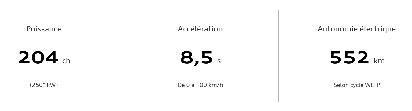 Gamme Audi Q4 e-tron : consommation électrique en cycle mixte WLTP (kWh/100 km) : 16,4 – 18,2. Rejets de C02 en cycle mixte WLTP (g/km) : 0. Valeurs liées à la configuration du véhicule et susceptibles d’évolution. Valeurs au 01/10/2024, susceptibles d’évolution.