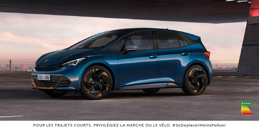 CUPRA Born 230 ch – Batterie L: Autonomie électrique WLTP en cycle mixte : 373 – 422 km. Consommation électrique mixte de la gamme présentée (kWh /100km) WLTP : 15,5 – 17,4. Rejets de CO2 (g/km) : 0 (en phase de roulage). Valeurs au 02/04/2024, susceptibles d’évolution. Plus d’informations auprès de votre partenaire.