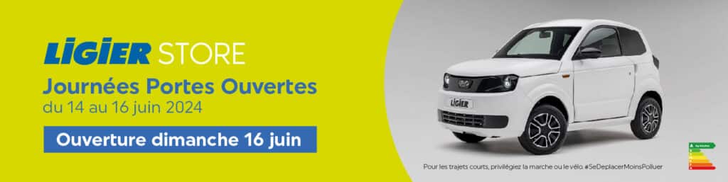 (1) LIGIER Myli G.OOD EV 4,14 kWh en Location avec Option d’Achat sur 48 mois avec une remise exceptionnelle de 900 €, premier loyer majoré de 4 775 € ramené à 3 875 € après déduction du bonus écologique de 900 €, suivi de 47 loyers mensuels de 99 € dans le réseau participant. Montant total dû par le locataire en cas d’acquisition du véhicule au terme du contrat : 13 367,95 €. Un crédit vous engage et doit être remboursé. Vérifiez vos capacités de remboursement avant de vous engager. *Remise exceptionnelle de 900€ pour toute commande avec immatriculation jusqu’au 30/06/2024 déduite. Bonus écologique de 900€ déduit. **Offre à particuliers non cumulable en Location avec Option d’Achat sur 48 mois et 30 000km dans le réseau Ligier Group participant valable pour toute commande avec immatriculation jusqu’au 30/06/2024, dans la limite des stocks disponibles. Exemple pour une LIGIER Myli G.OOD EV 4,14 kWh au prix tarif constructeur du 01/01/2024 de 12 999€. Option d’Achat finale : 4 839,60€ ou reprise de votre véhicule suivant engagement sous conditions de votre Distributeur. Durée totale du financement : 48 mois. Dans le cadre de votre financement, vous disposez d’un délai de rétractation. Sous réserve d’acceptation de votre dossier par SANTANDER CONSUMER FINANCE S.A. – Siège social : Ciudad Grupo Santander, Avenida Cantabria s/n, 28660 Boadilla del Monte, Madrid (Espagne) – Société de droit espagnol immatriculée au Registro Mercantil de Madrid sous le n°0000249773 – Succursale en France : 26, Quai Charles Pasqua, 92300 Levallois-Perret (France) – Immatriculée au RCS de Nanterre sous le numéro 915 062 012 – Etablissement de crédit régi par l’Autorité de contrôle Prudentiel et de Résolution (ACPR – 4 Place de Budapest, CS 92459, 75436 Paris Cedex 09) | Intermédiaire européen en assurance immatriculé sous le n°OV0089 (http://www.orias.fr).