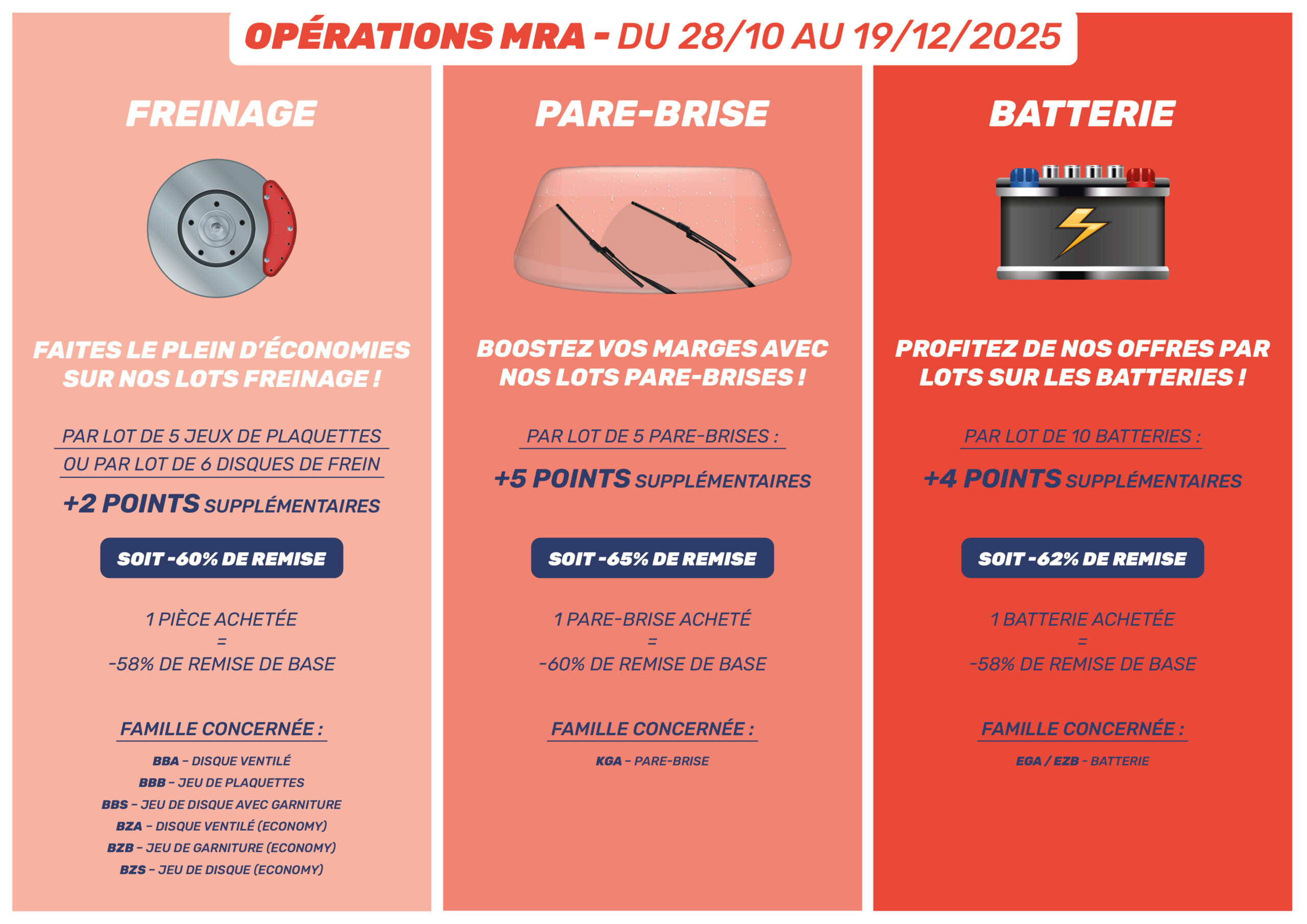 Sur les familles freinage, pare-brises et batteries, bénéficiez de remises exceptionnelles allant jusqu’à –65 % grâce à vos achats en lots.
