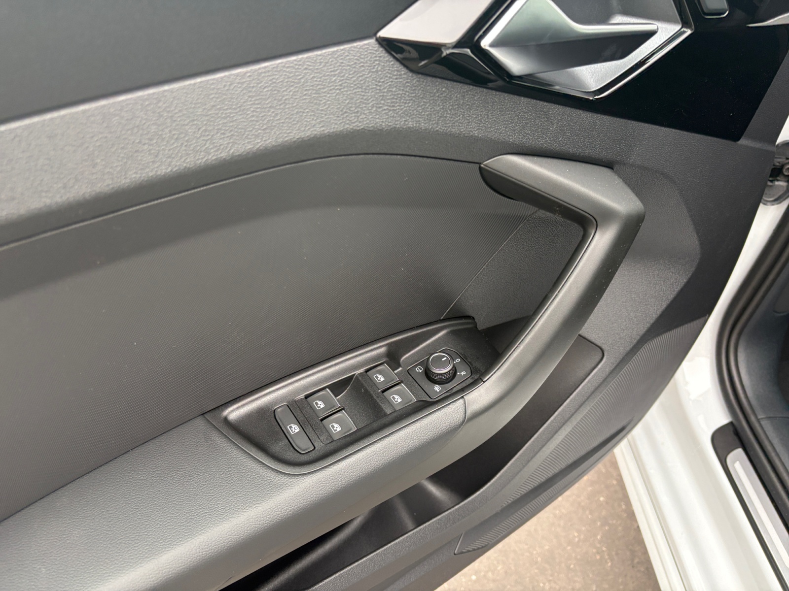 Applications décoratives étendues en laque Quartz Gris structuré dans l'insert du diffuseur d'air et de la console centrale ainsi que dans la poignée de la commande intérieure de verrouillage des portières
