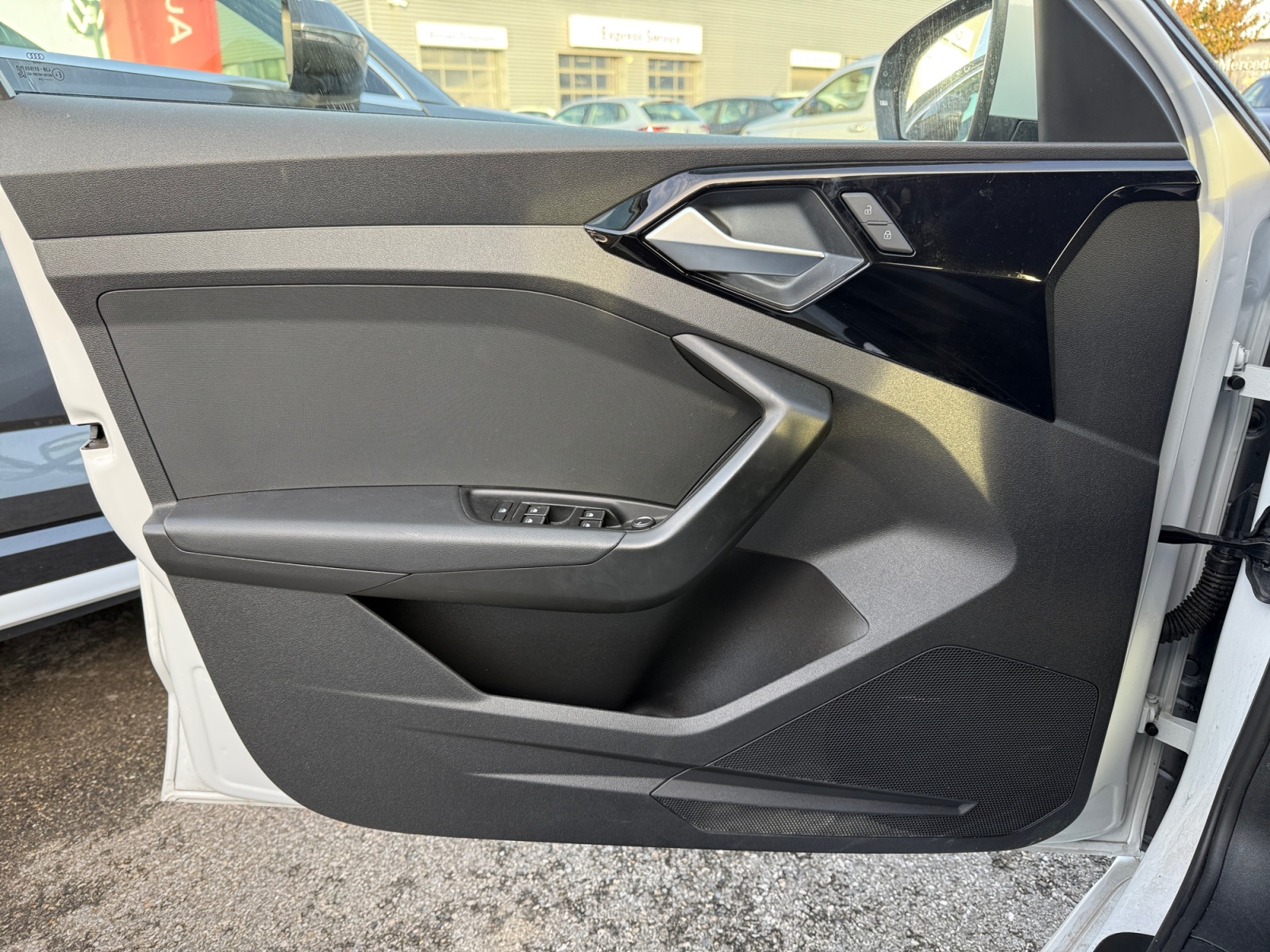 Applications décoratives étendues en laque Quartz Gris structuré dans l'insert du diffuseur d'air et de la console centrale ainsi que dans la poignée de la commande intérieure de verrouillage des portières