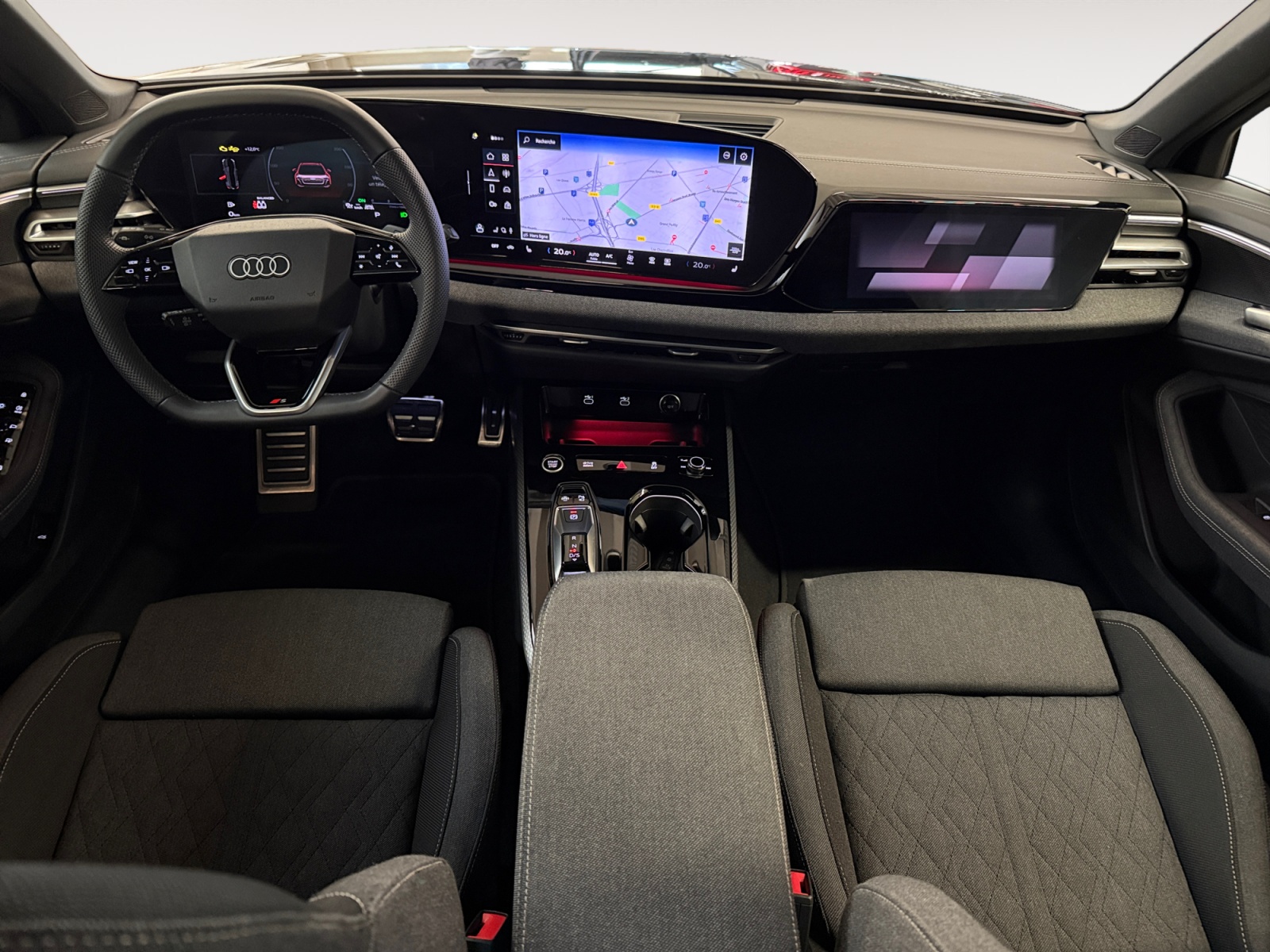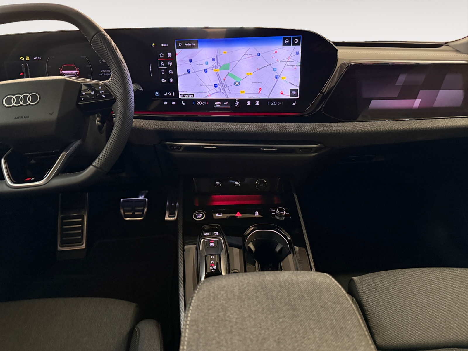 Navigation MMI avec MMI touch Le système de navigation MMI plus avec MMI touch offre : - l'écran panoramique MMI avec technologie OLED, comprenant l'Audi virtual cockpit plus avec écran de 11,9 pouces ainsi que l'écran MMI touch de14,5" - système de navigation avec affichage des cartes et guidage routier sur l'écran couleur haute résolution de 14,5" - mise à jour des cartes en ligne - Affichage de cartes en 3D montrant de nombreux sites d'intérêt - informations routières en ligne - MMI search - MMI touch