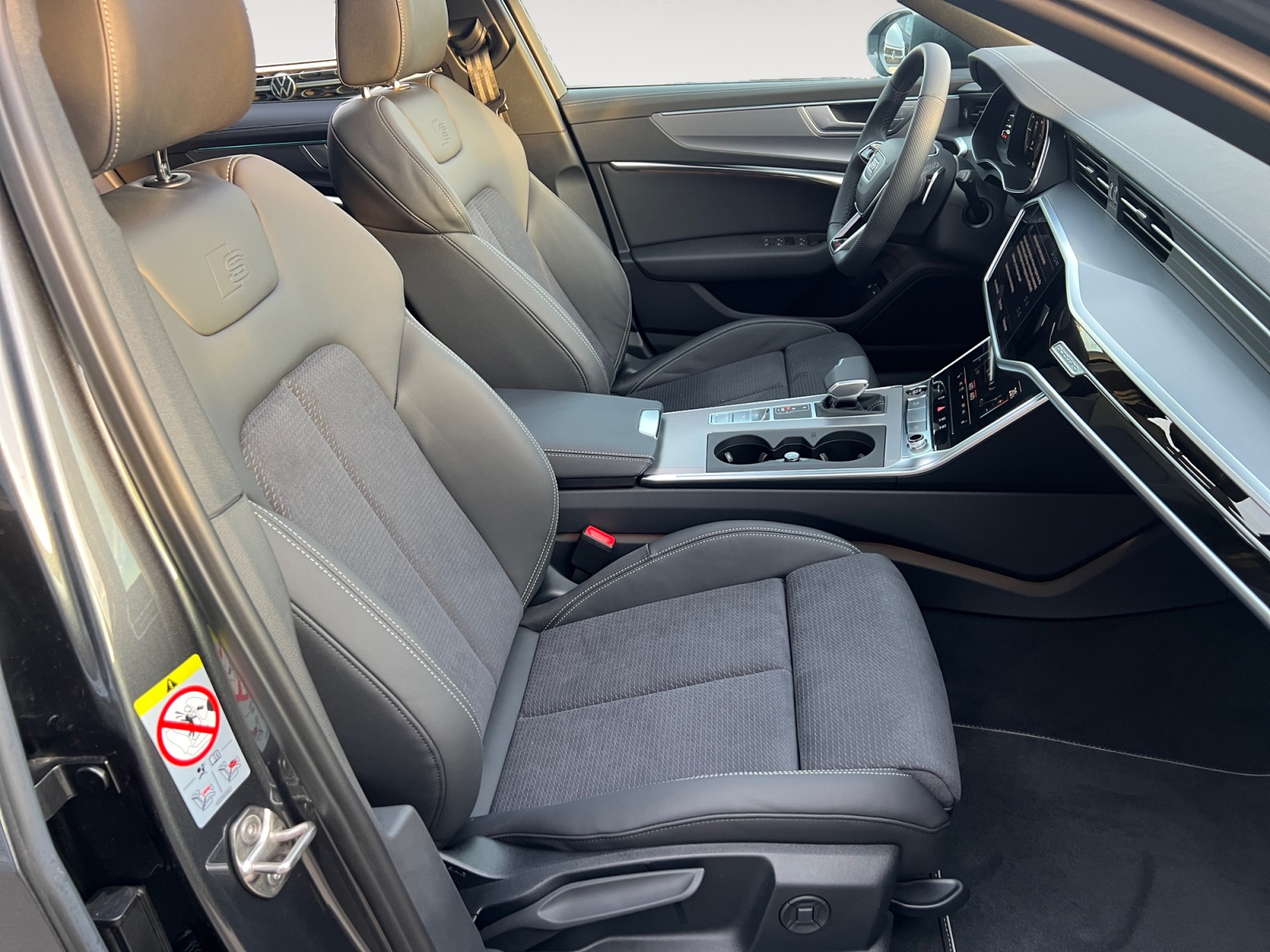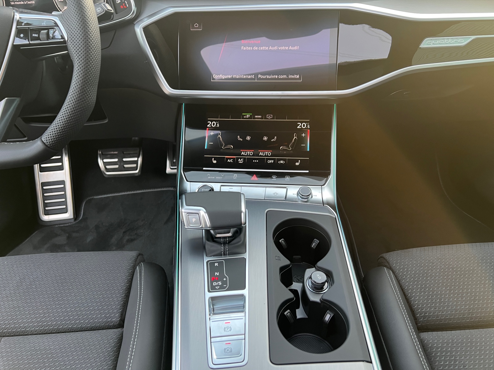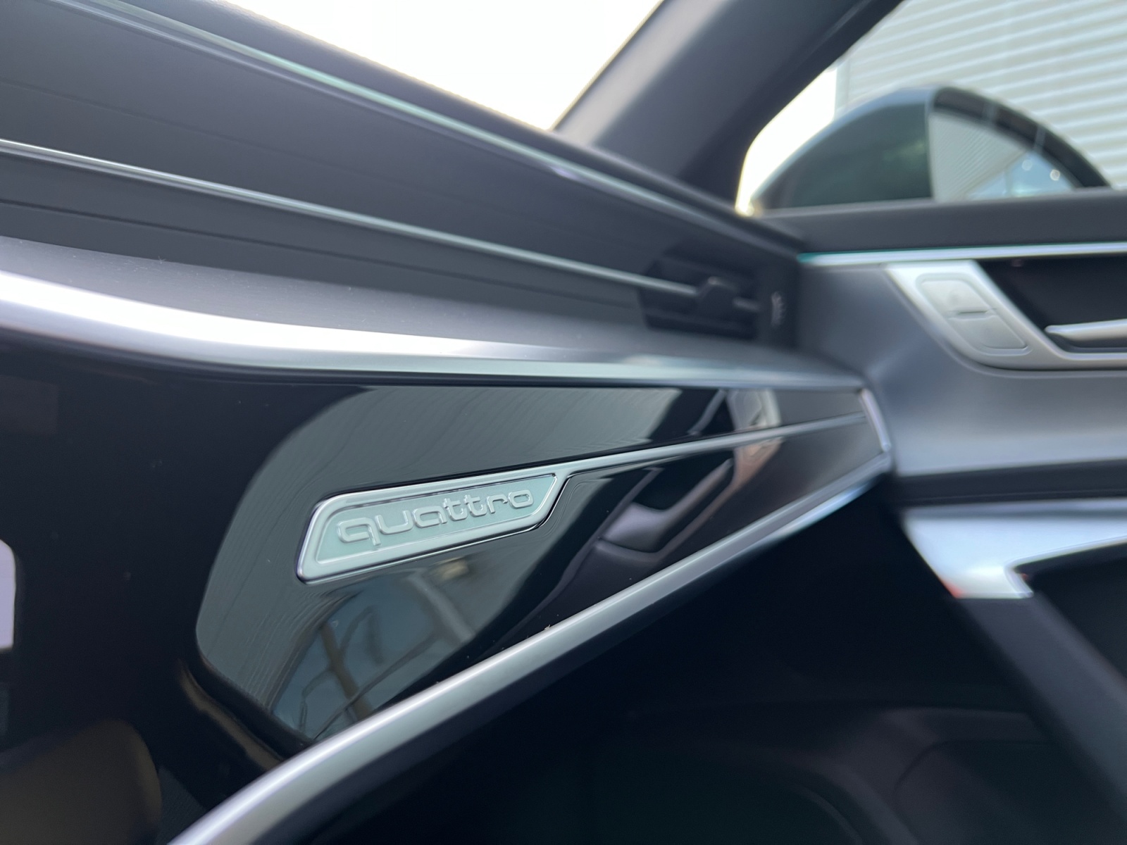 Eclairage de contour avec inscription quattro éclairée ou anneaux Audi éclairés sur traction AV sur le tableau de bord côté passager AV