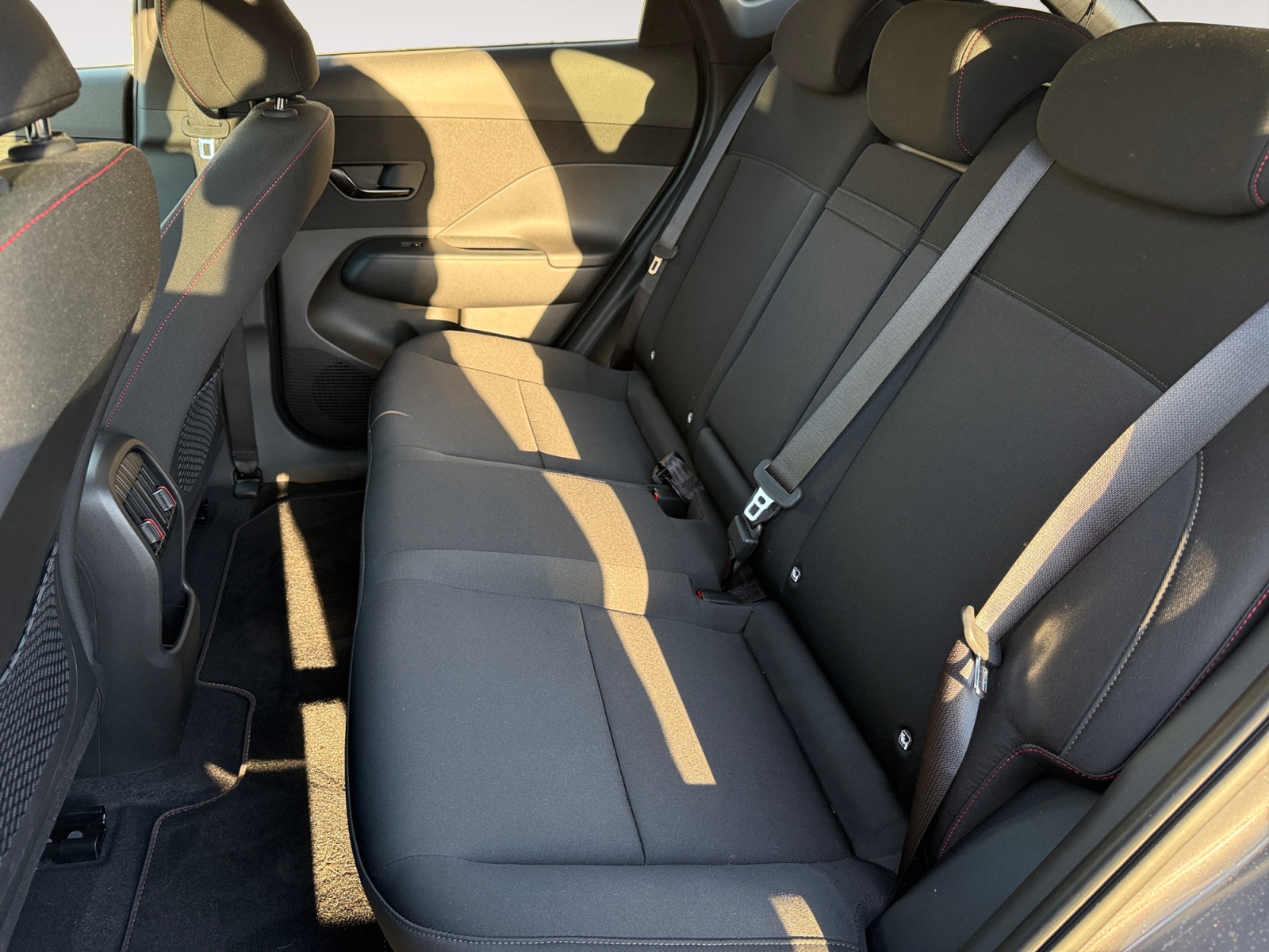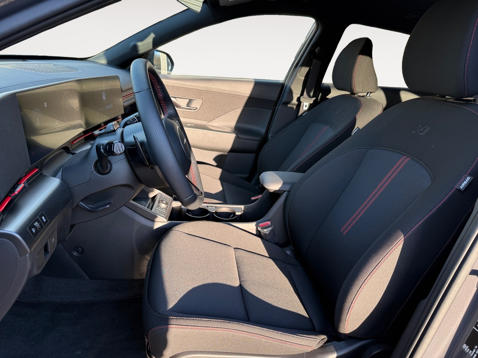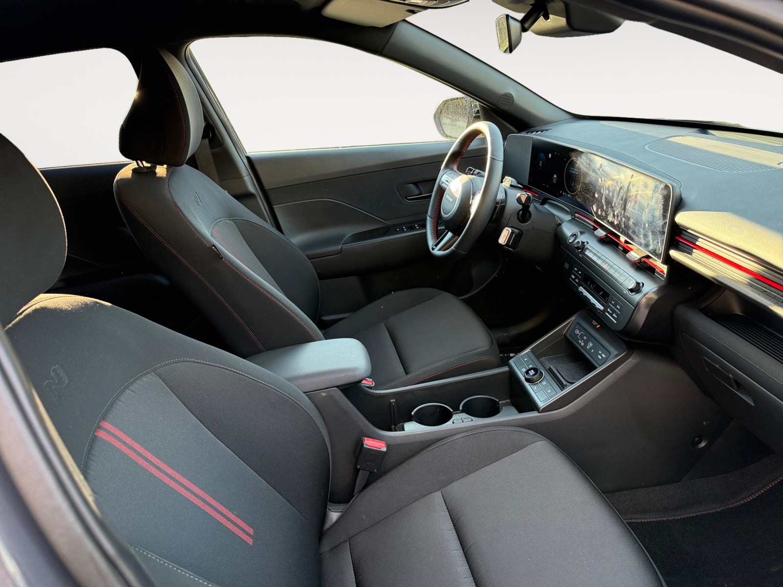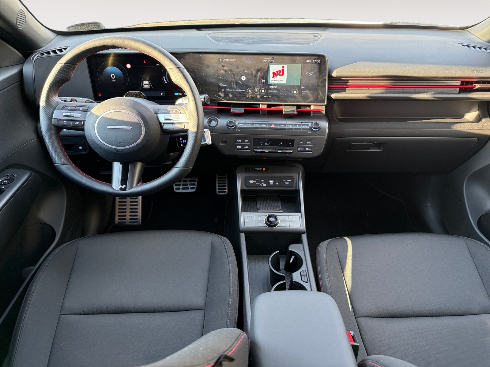 Atmosphère intérieure N Line intérieur noir intégral avec inserts décoratifs, liserés et surpiqures rouges, ciel de toit noir, pédalier façon aluminium