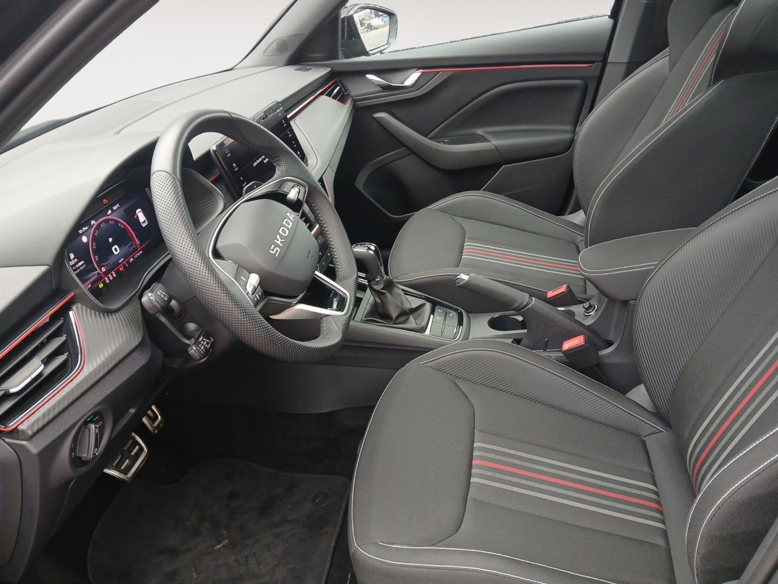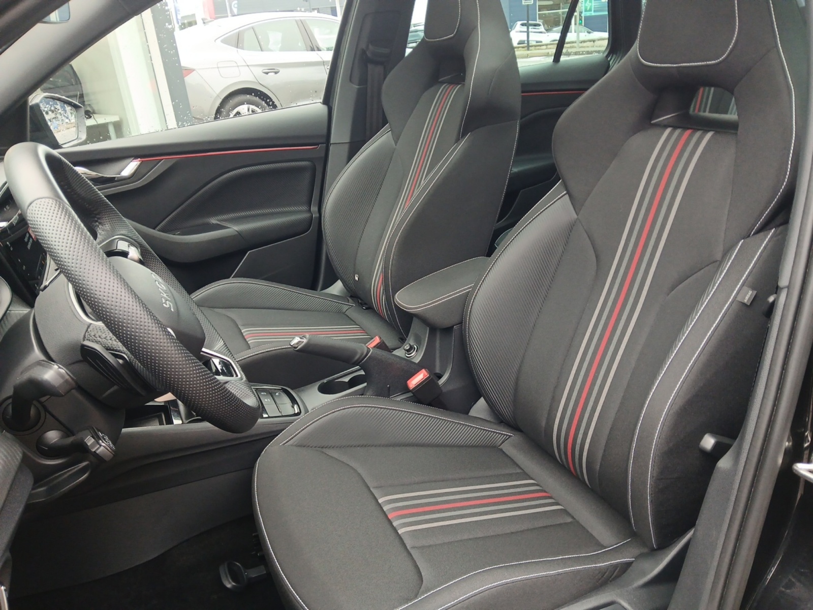 Insert décoratif sur la planche de bord effet Carbone avec liseré rouge et inserts de porte matériau synthétique effet carbone