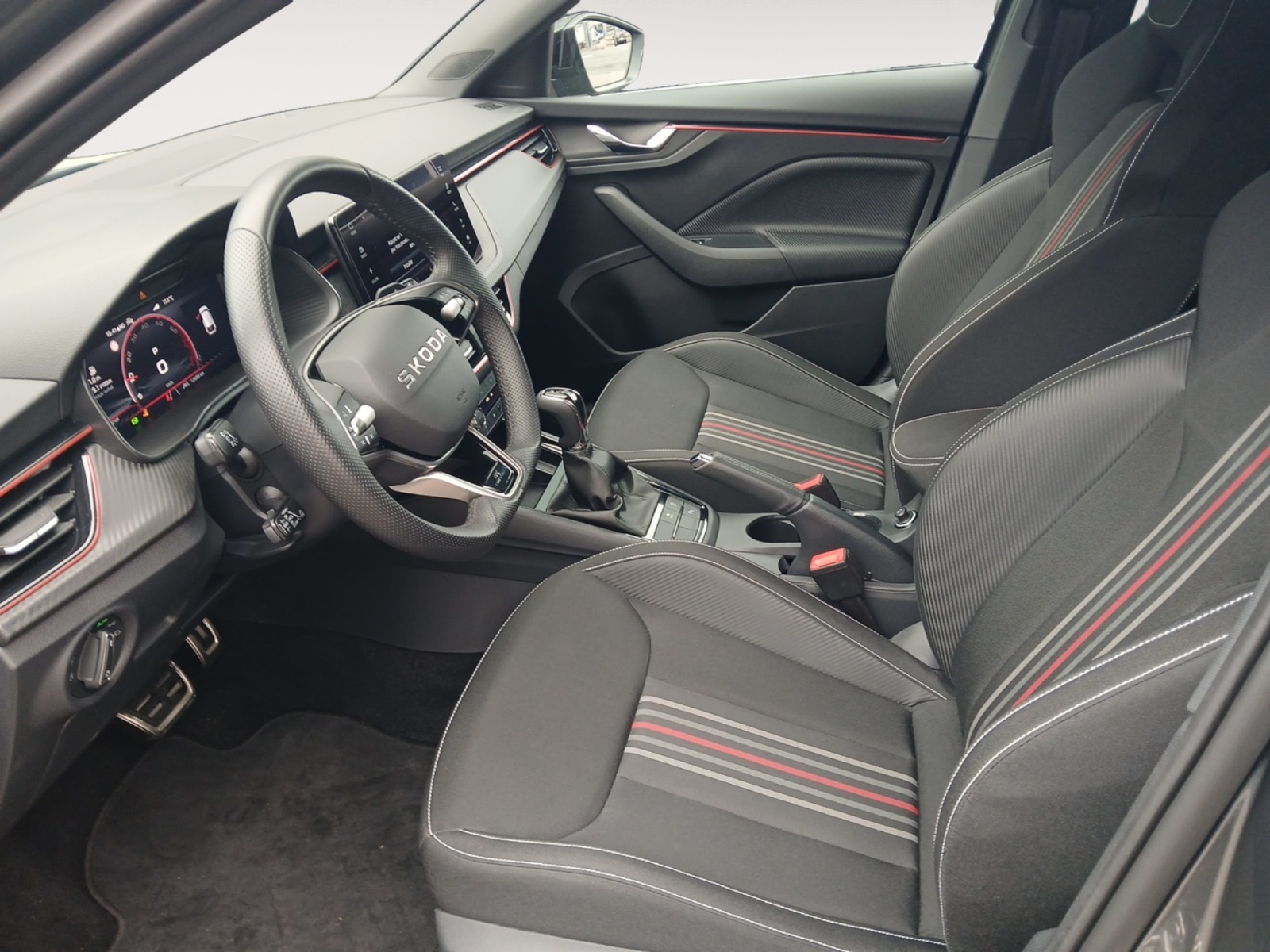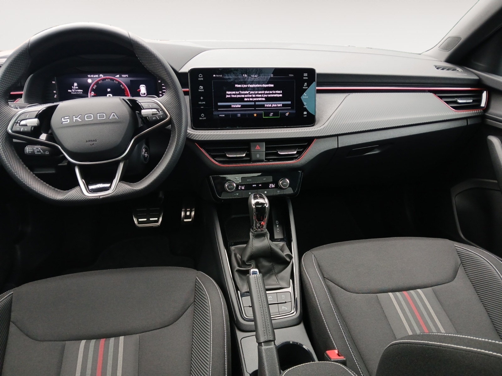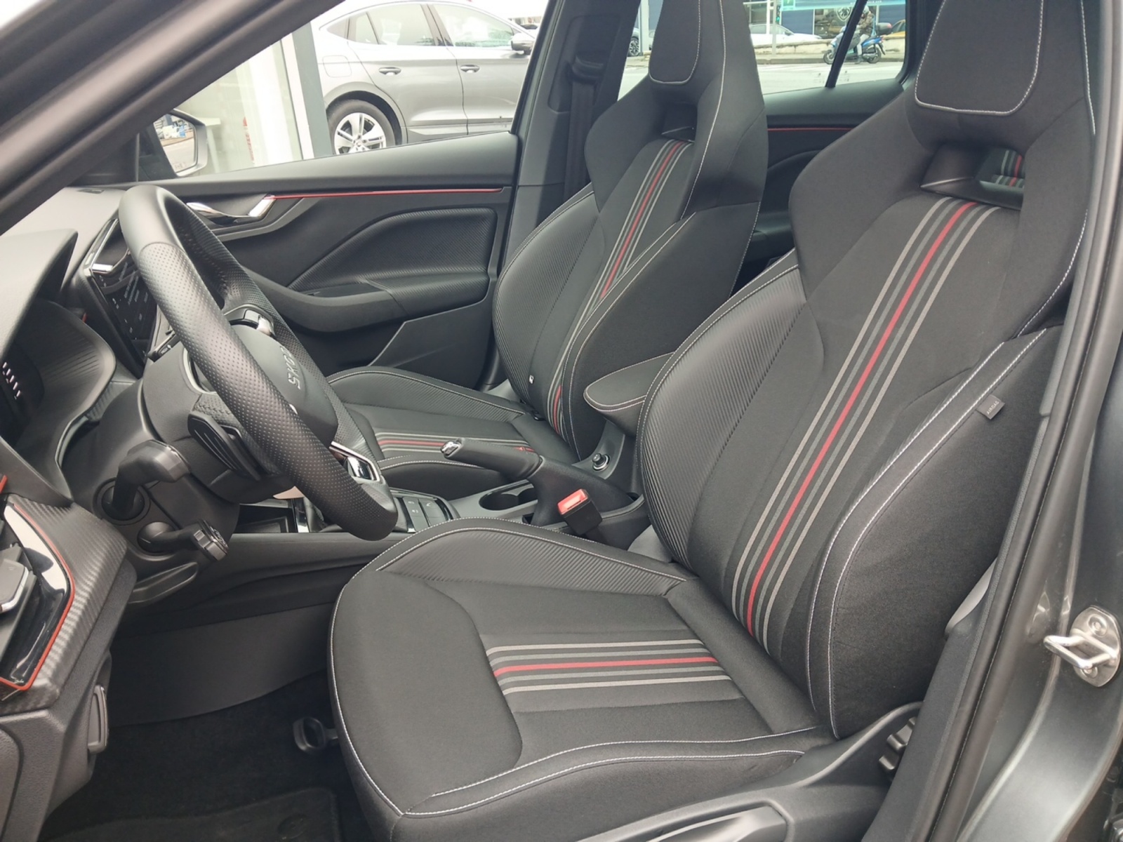 Insert décoratif sur la planche de bord effet carbone avec liseré rouge et inserts de porte matériau synthétique effet carbone