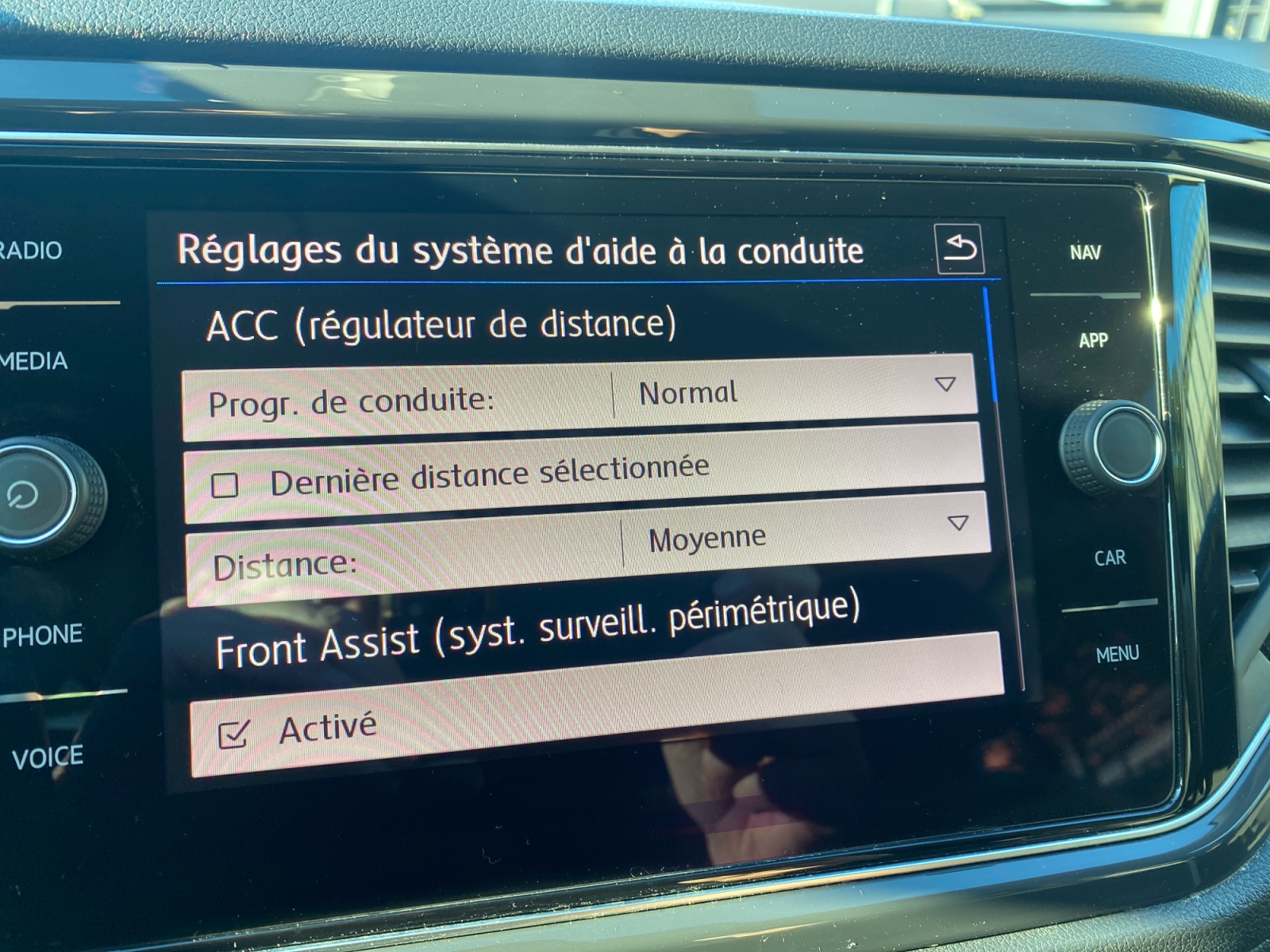 Régulateur de vitesse adaptatif ACC : détecte dans les limites du systéme et l´aide d´un capteur radar les véhicules qui précèdent et maintient la distance en intervenant sur les freins et laccélérateur (régulation active de 30 à 160 km/h pour boîte manuelle, de 0 à 160 km/h pour boîte DSG ; jusquà larrêt du véhicule uniquement avec DSG). Le conducteur peut calibrer la distance souhaitée par rapport aux autres automobilistes selon quatre niveaux