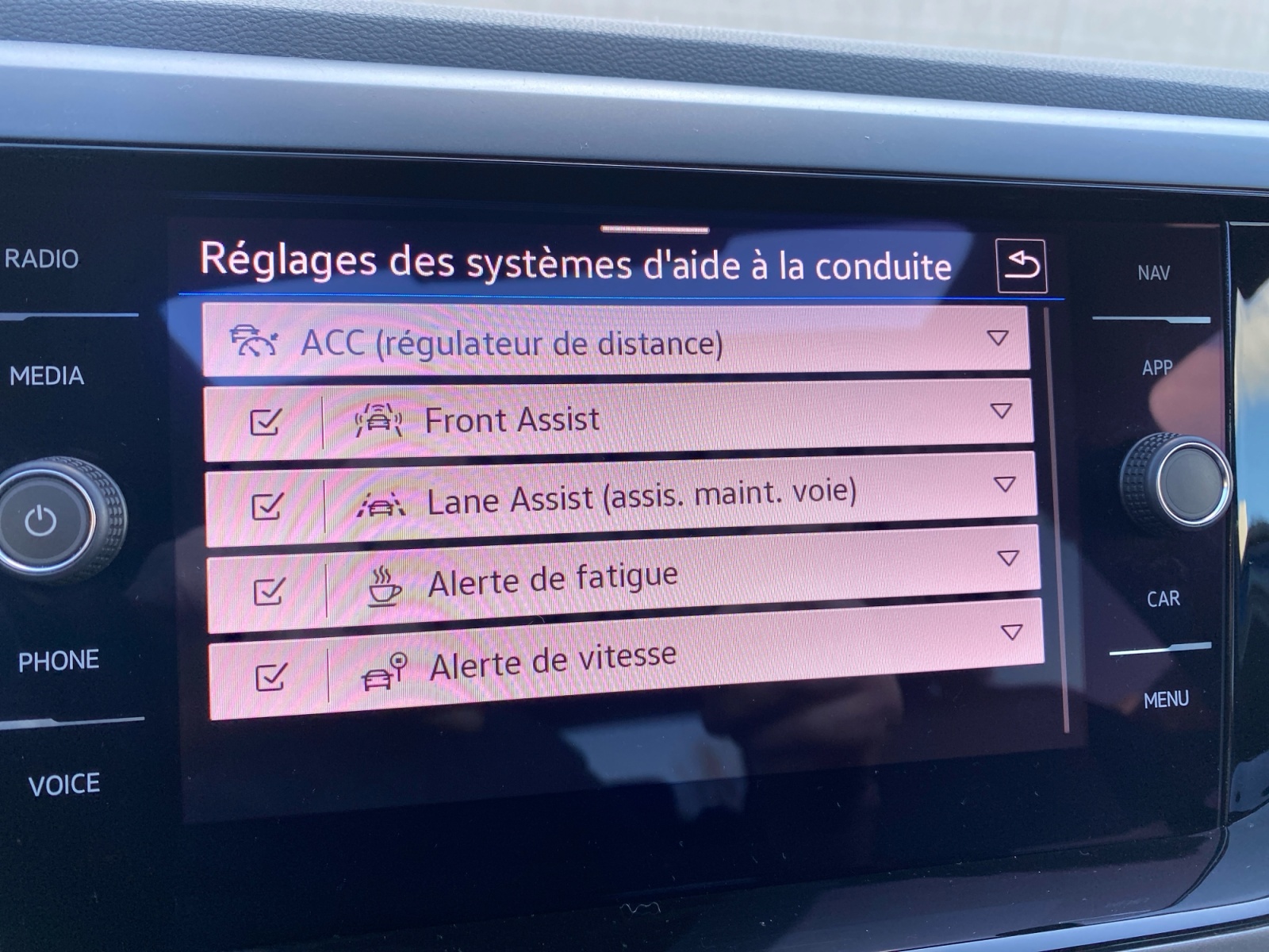 Front Assist: système de surveillance périmétrique contribuant à la prévention des collisions avec fonction de détection des piétons et des cyclistes. Ce système freine automatiquement le véhicule en cas de détection d'obstacle aussi bien en ville que sur autoroute
