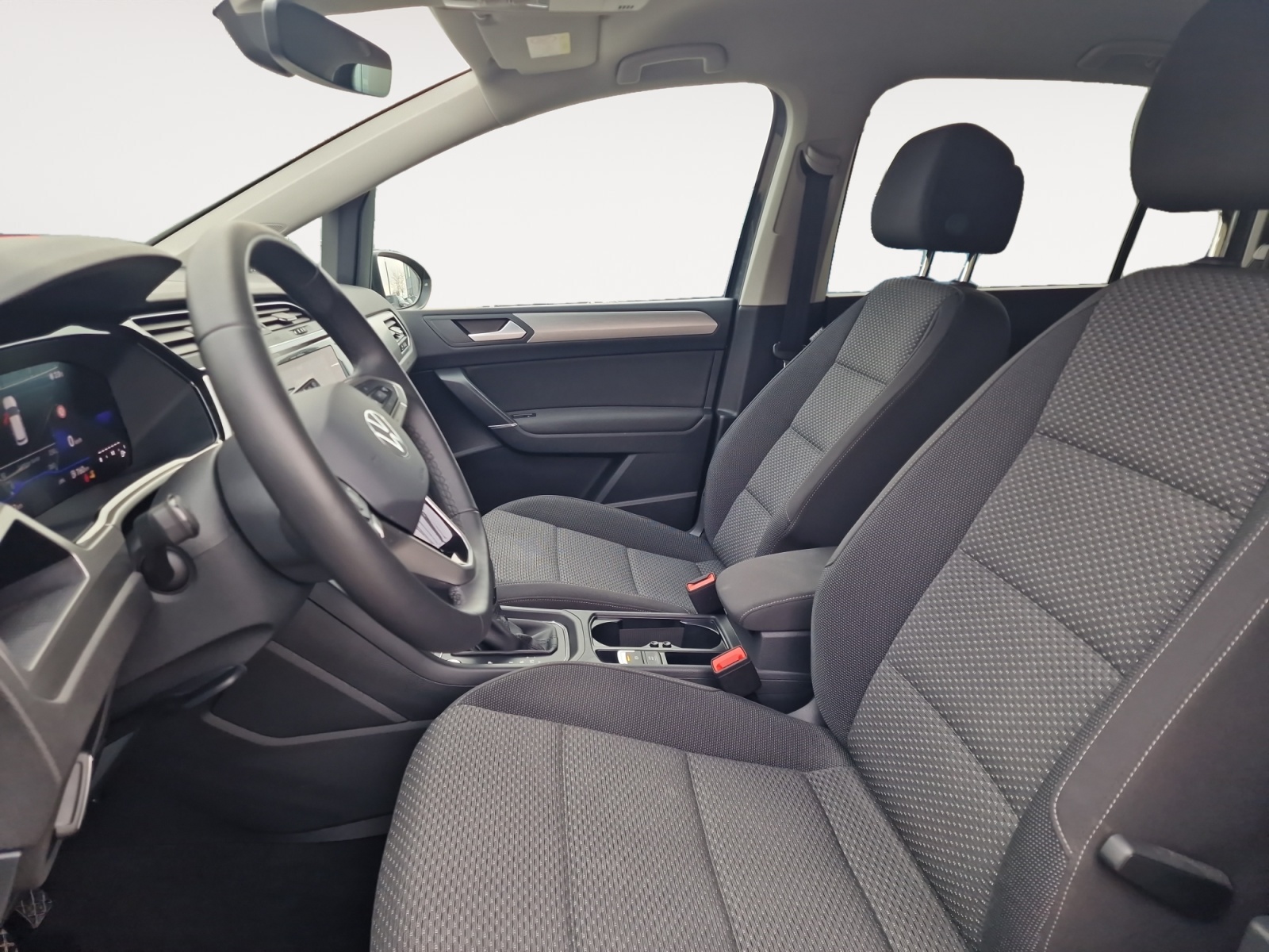Accoudoir central AV réglable avec compartiment de rangement, porte-gobelet intégré, et prise 12 V pour les passagers AR